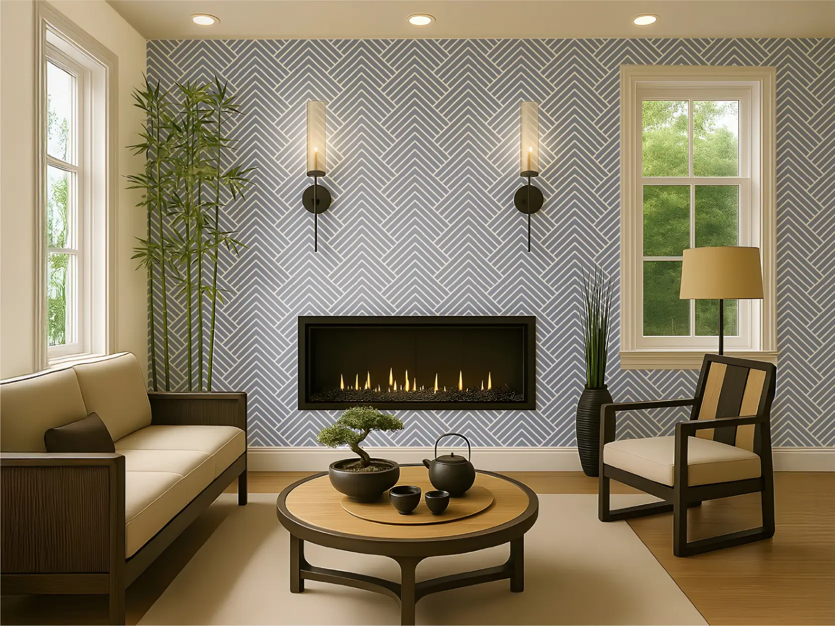 Papel pintado autoadhesivo con un elegante diseño de espiga japonesa en esquema negativo. Acabado satinado, fácil de colocar sin cola. Ideal para un ambiente minimalista y sofisticado.