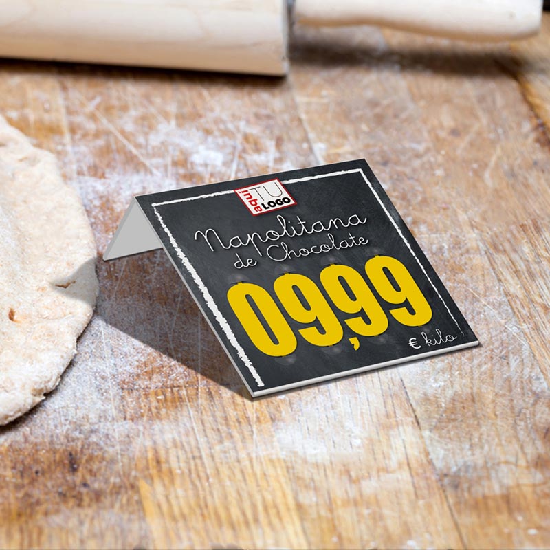 Portaprecio y juego de números. Tamaño 8 cm x 8 cm y una solapa en la parte superior de 3 cm. Dispone de 5 diseños que podrá personalizar con su logotipo y el texto que desee.